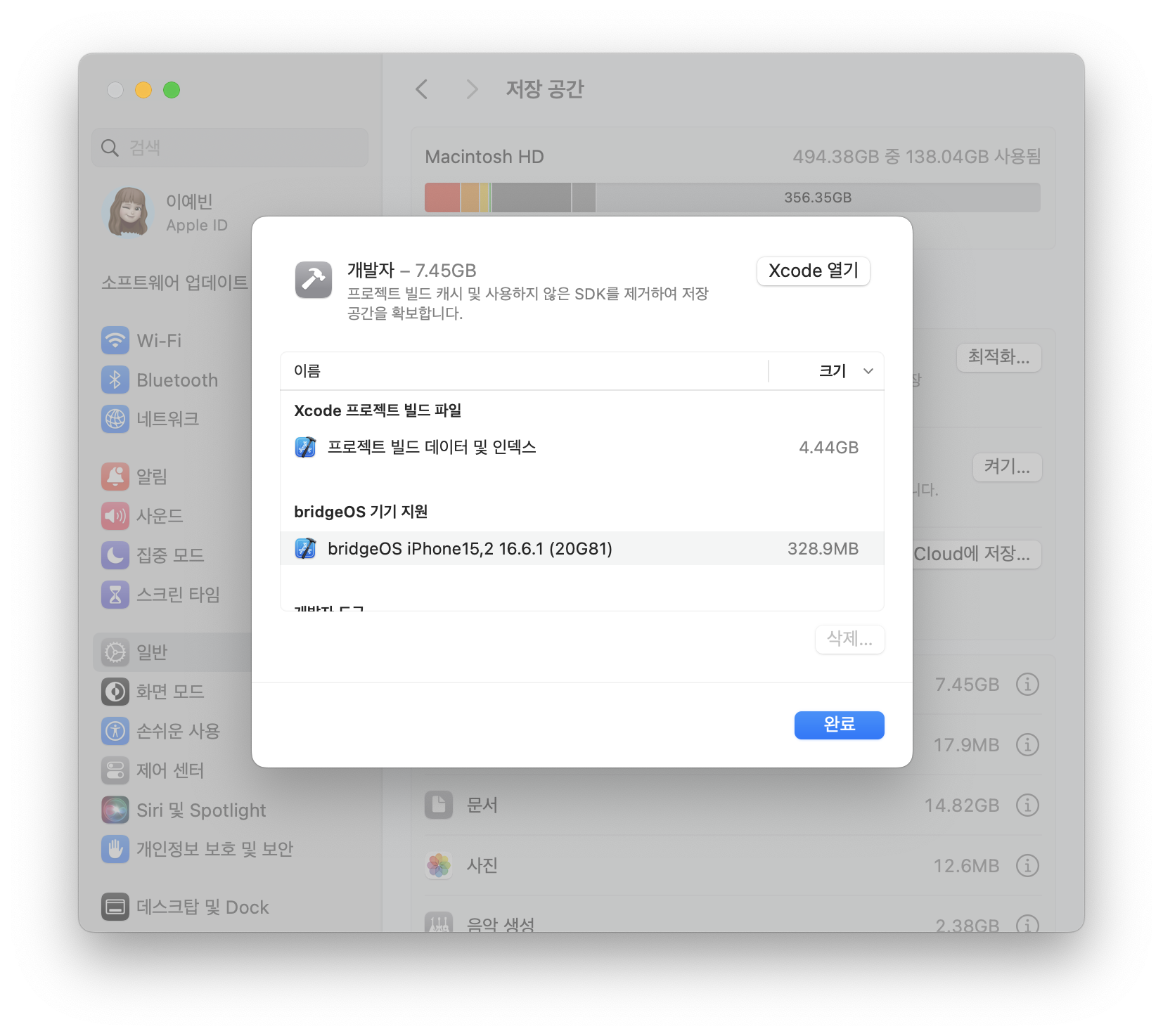 5. 'Xcode 프로젝트 빌드 파일' 목록에 'Xcode 캐시' 항목이 있으면 그 항목을 선택하고 삭제한다. (현재 나는 그 캐시를 지워서 잘 작동한다.)