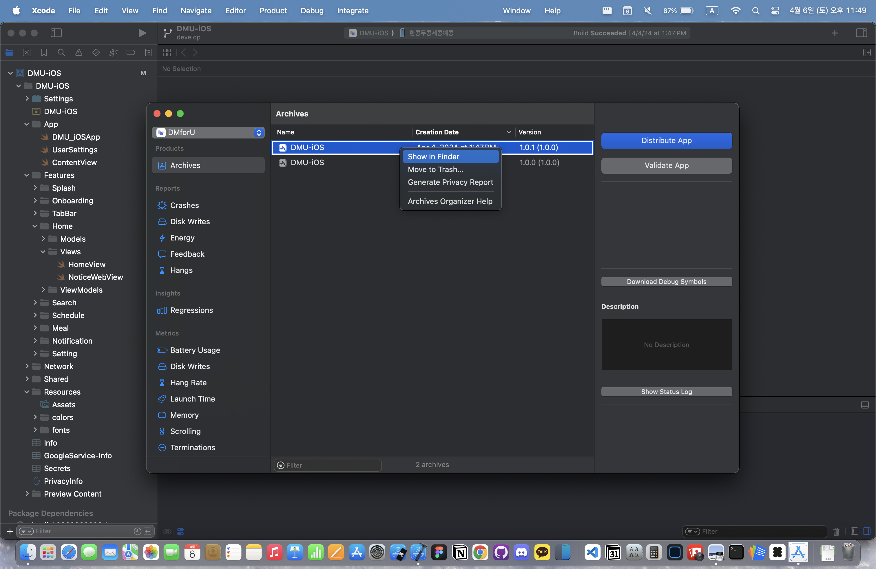 2. 출시한 버전을 [우클릭] - [Show in Finder]로 연다.