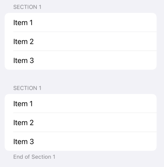 import SwiftUI struct ContentView: View { let data = ["Item 1", "Item 2", "Item 3"] var body: some View { List { Section(header: Text("Section 1")) { ForEach(data, id: \.self) { item in Text(item) } } Section(header: Text("Section 1"), footer: Text("End of Section 1")) { ForEach(data, id: \.self) { item in Text(item) } } } } }