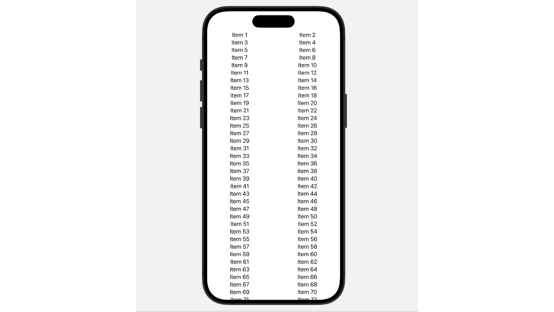 struct ContentView: View { let columns = [ GridItem(.flexible()), GridItem(.flexible()) ] var body: some View { ScrollView { LazyVGrid(columns: columns) { ForEach(1...1000, id: \.self) { i in Text("Item \(i)") } } } } }